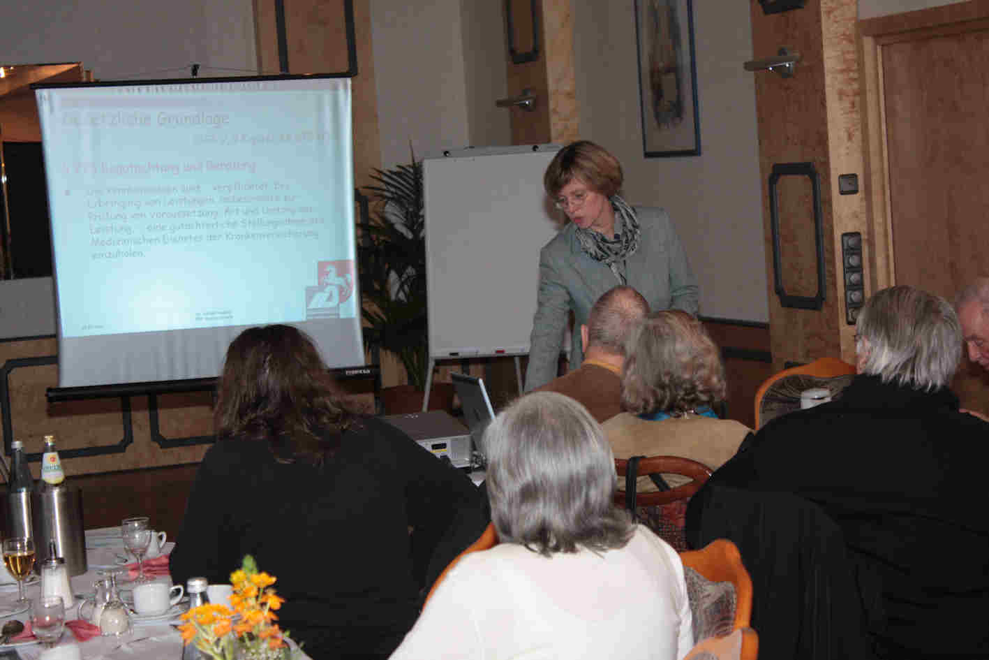 Nach einem gemeinsamen Imbiss hielt Frau Dr. Ulrike Fondahl, Fachärztin für Ernährung, Innere- und Sozialmedizin und Leiterin des MDK Braunschweig einen Vortrag über die Struktur, Organisation und Aufgaben des medizinischen Dienstes der Krankenkassen. Der MDK ist der sozialmedizinische Gutachterdienst der gesetzlichen Kranken- und Pflegeversicherungen. Er besteht seit 1989 und ist aus dem vertrauensärztlichen Dienst hervorgegangen. Seit 1995, mit dem Inkrafttreten des SGB XI, ist er auch für die Durchführung von Pflegegutachten zuständig. Die Träger sind die Landesverbände der Ersatz-, Orts-, Betriebs- und Innungskassen, deren Versicherte den MDK durch eine Umlage finanzieren. Er ist eine Körperschaft des öffentlichen Rechts (In den neuen Bundesländern ist der MDK ein eingetragener Verein). Zu den insgesamt fast 7.000 Beschäftigten zählen neben den Ärzten und Pflegekräften auch andere Heilberufe, Wirtschaftsdienste und Verwaltungsangestellte. In Niedersachsen und Bremen gibt es insgesamt 14 Standorte. Pneumologen gibt es in Bremen und Osnabrück.